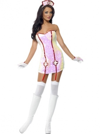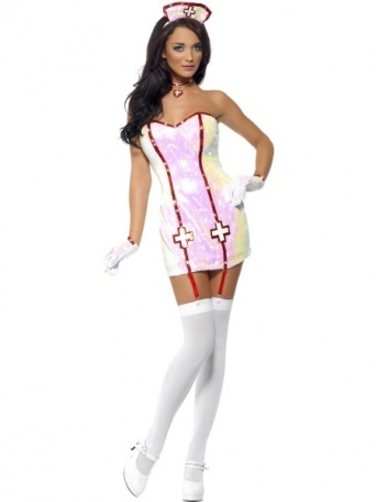 Jedinečný sexy kostým zdravotní sestřičky obsahuje flitrované mini šatičky s podvazky, rukavice a čelenku do vlasů.